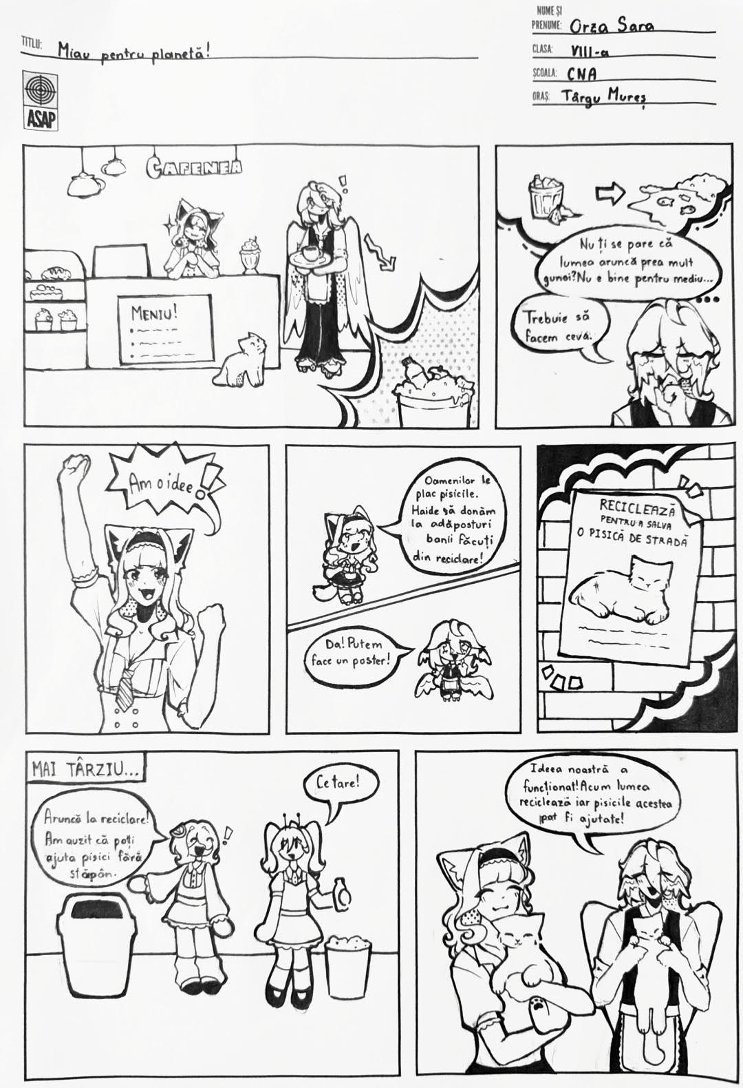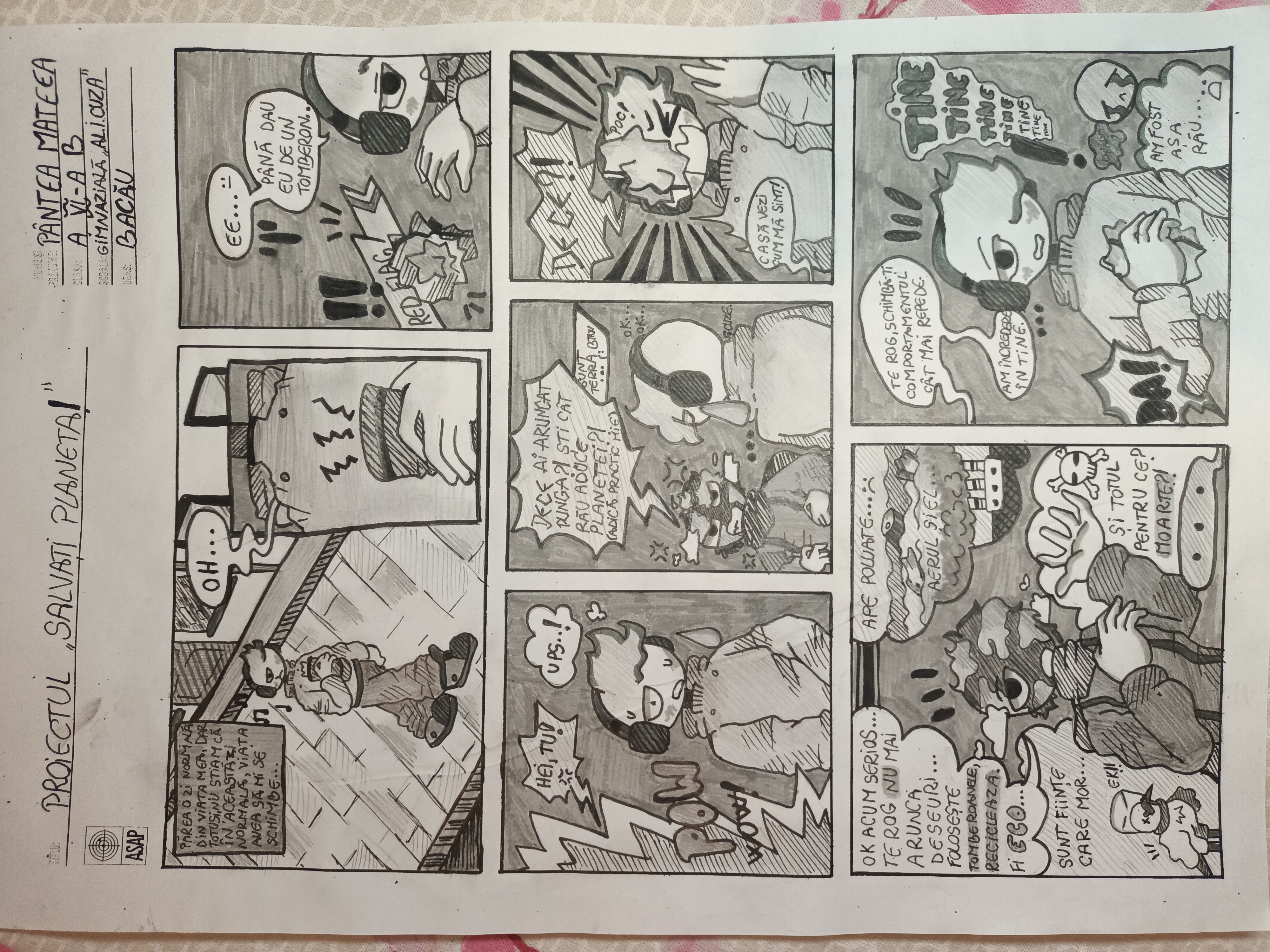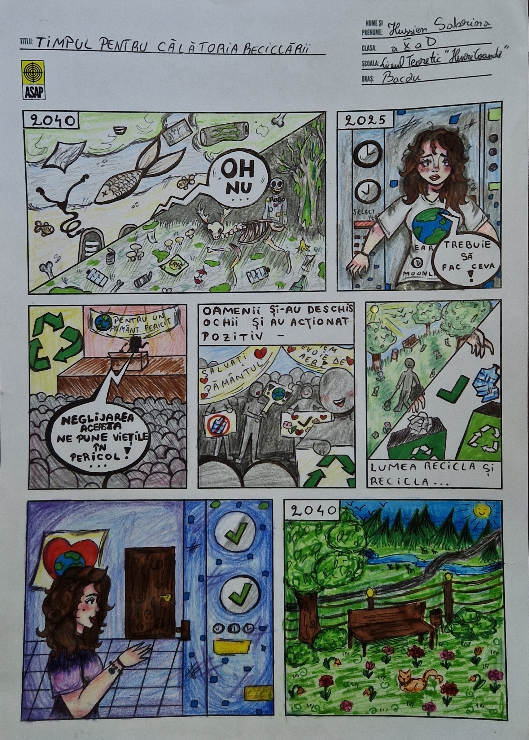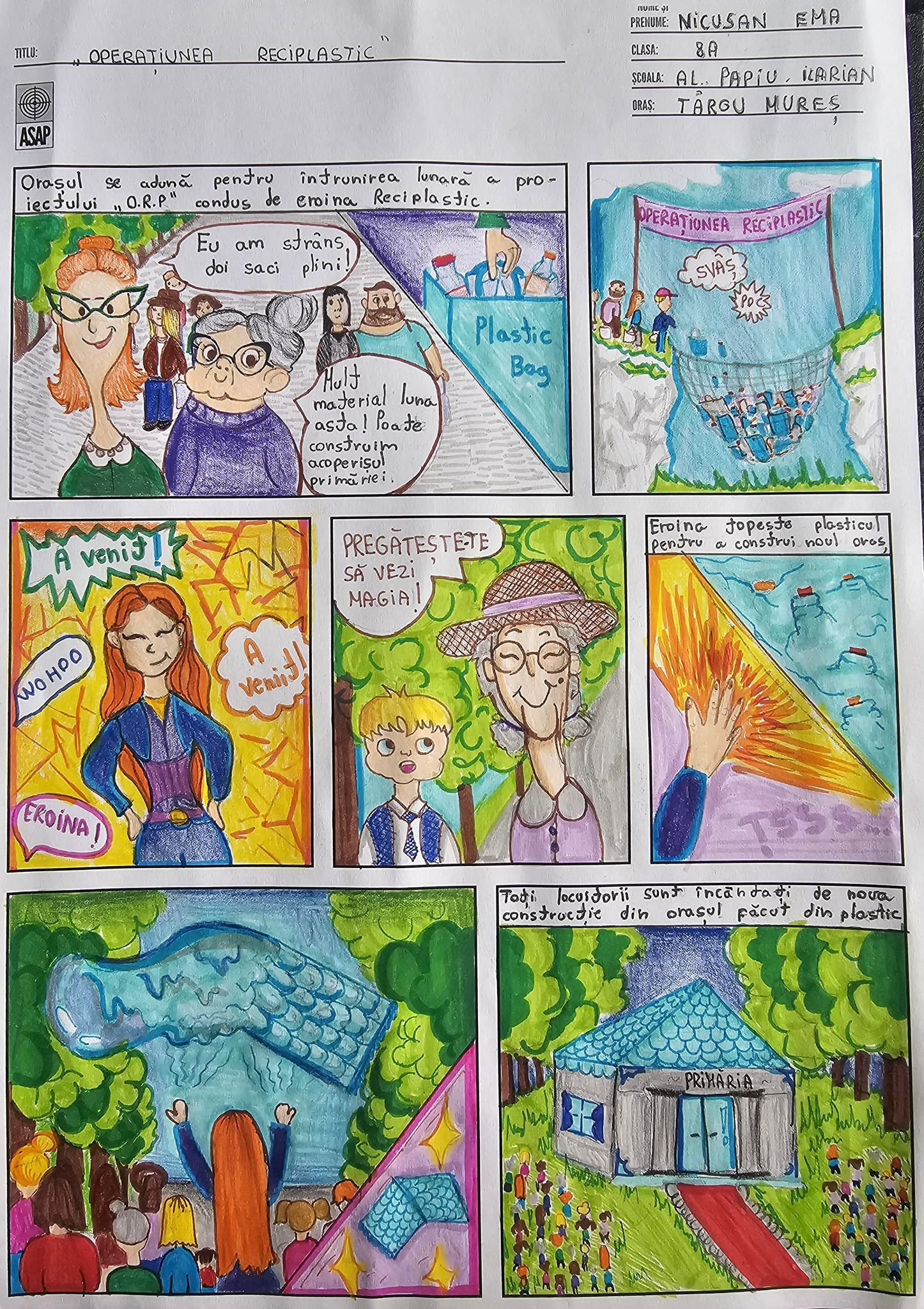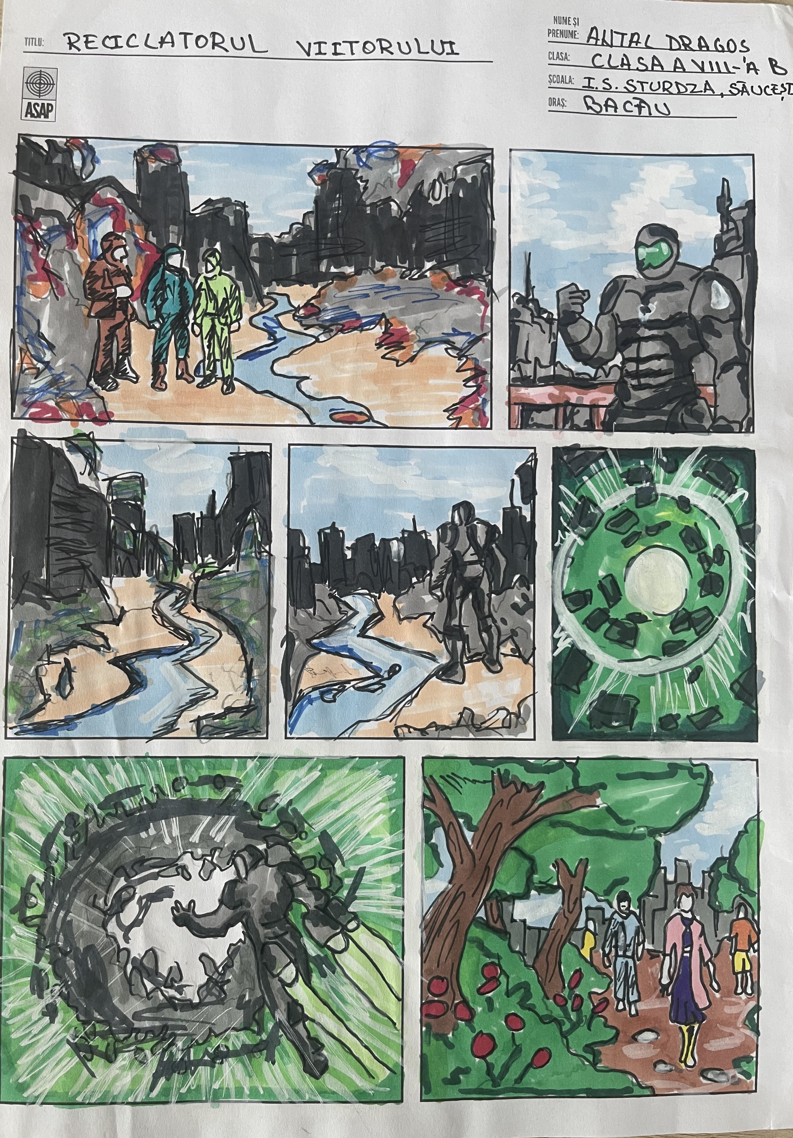 „Într-o lume plină de indiferență, fii tu schimbarea!” este titlul lucrării unuia dintre elevii participanți la ediția a șasea a concursului de benzi desenate BANDA ASAP, organizat de ASAP România în parteneriat cu Animest, de această dată pentru elevii de gimnaziu și de liceu din județele Bacău și Mureș. Mesajul surprinde perfect esența demersului: tinerii au folosit arta ca pe un instrument de implicare, transformând grijile lor pentru planetă în povești vizuale puternice și personaje care luptă pentru un viitor mai curat.