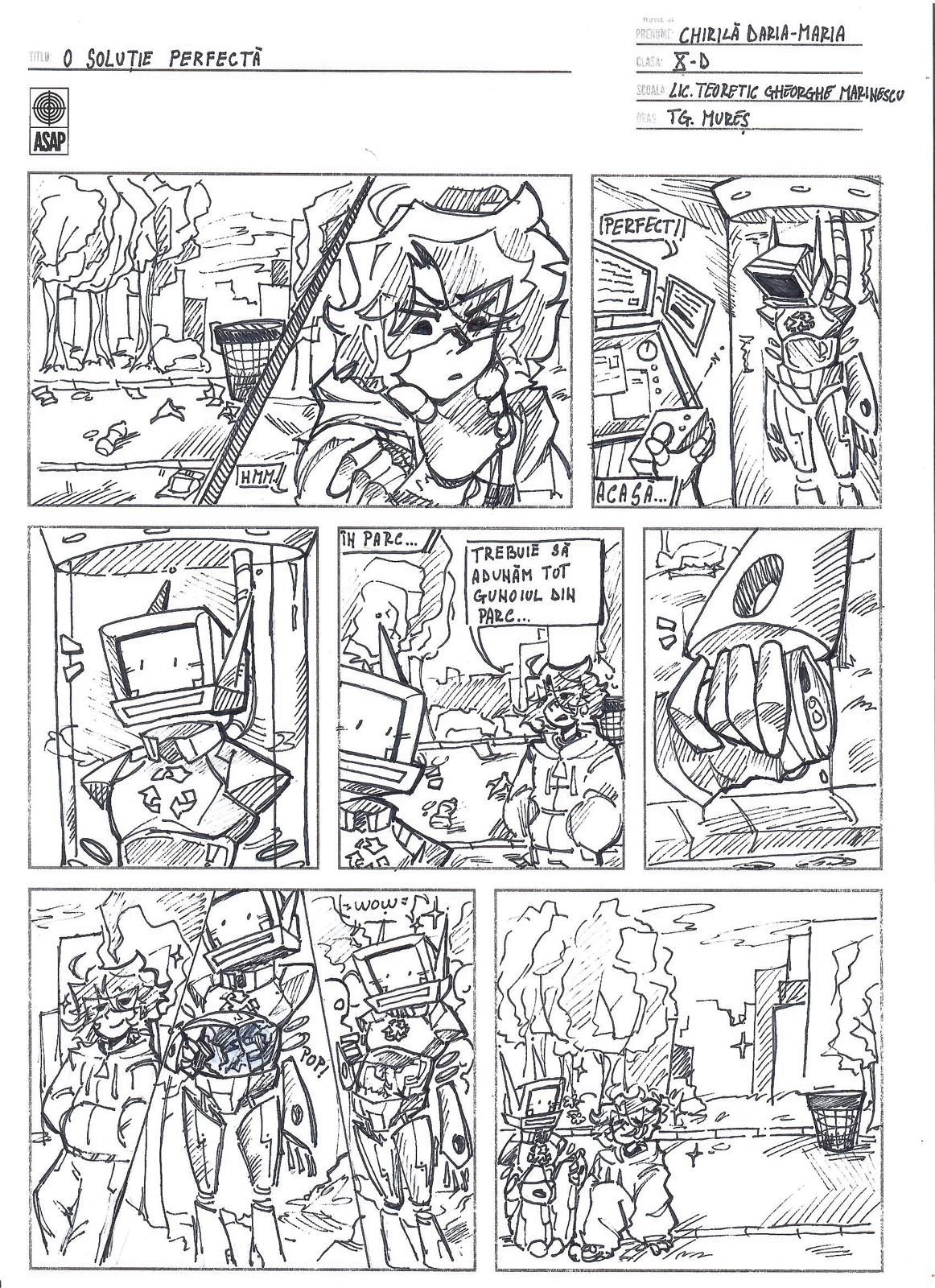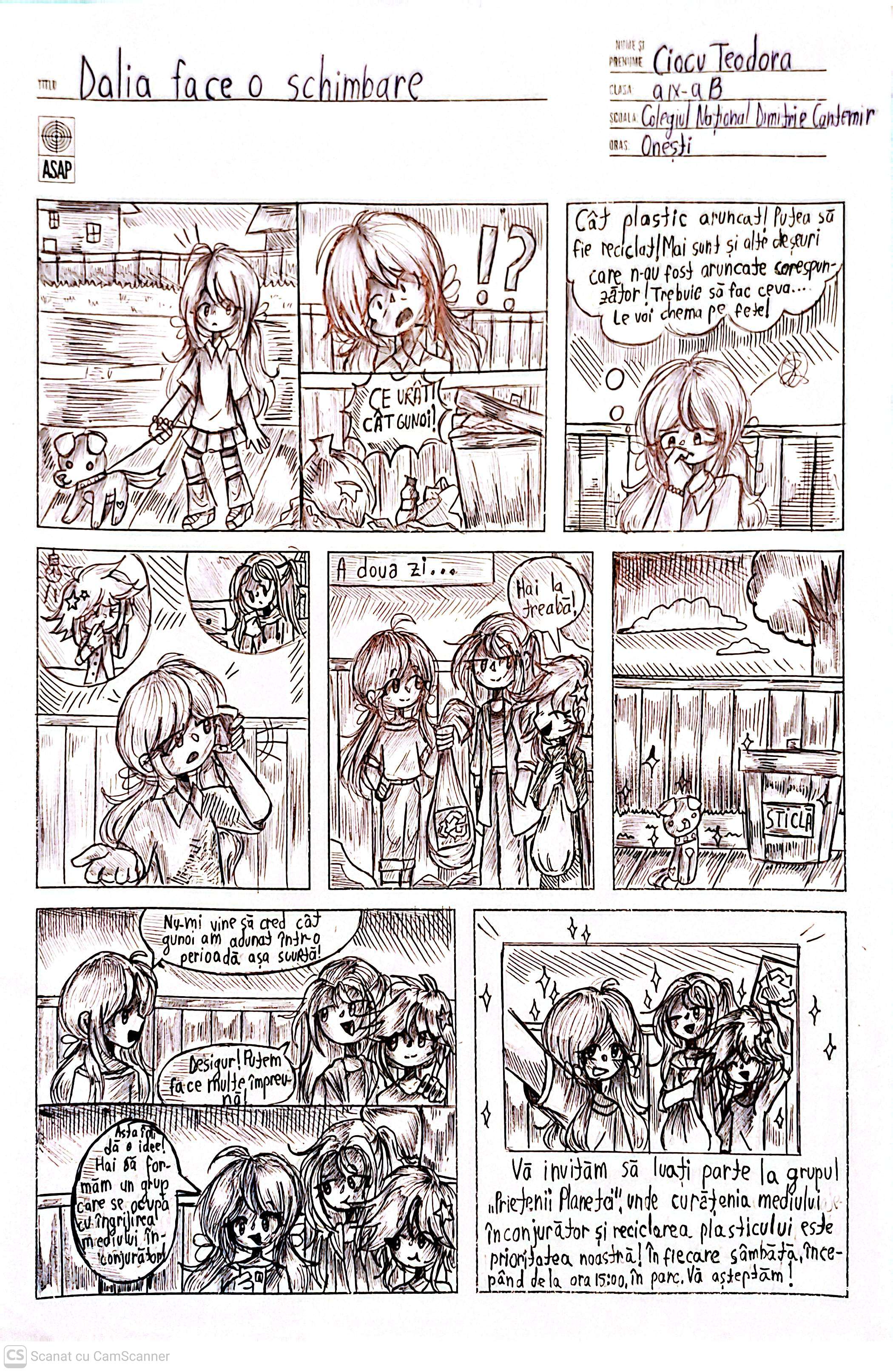 Teodora Ciocu (C.N. „Dimitrie Cantemir” Onești) spune că tema concursului a fost „bine aleasă”, într-un moment în care reciclarea este „o problemă profundă, care trebuie rezolvată cât mai repede și definitiv”. Prin lucrarea sa, Teodora a încercat să facă oamenii să zăbovească „preț de câteva clipe asupra foii albe…sau vii, pline de imagini” și să conștientizeze gravitatea problemei.